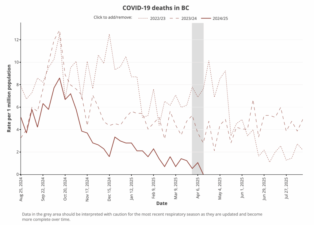 The 2024/25 respiratory virus season has ended and reporting will move to a spring-summer schedule on May 1. During this time, the Wastewater Surveillance dashboard will be updated weekly. The Facility Outbreaks dashboard will pause until fall. All other viral respiratory dashboards will be updated on the first Thursday of the month.