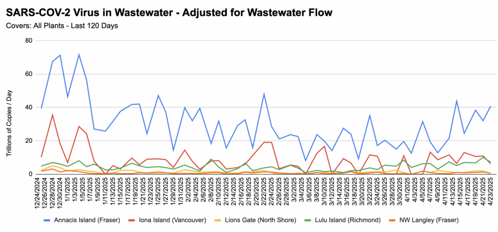 It’s been hard recently to distinguish “line going up” on the charts from random noise, but this week it looks pretty clear that COVID-19 levels are going up. Cases are up slightly, wastewater is definitely going up in Fraser.