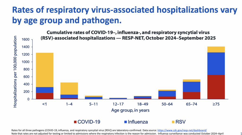 This slide deck from the Fall meeting of US CDC’s ACIP meeting (2025-09-19) says that COVID-19 is not, in fact, over. Here’s a breakdown of what respiratory viruses people in the hospital had: