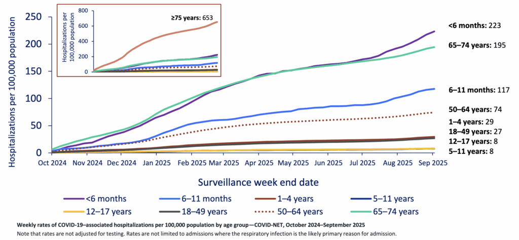 Even in a year which this US CDC report (2025-09-11) says was the worst influenza season in fourteen years, there’s still almost as much COVID-19 as flu in hospitals among people over 50, and a significant amount in infants.