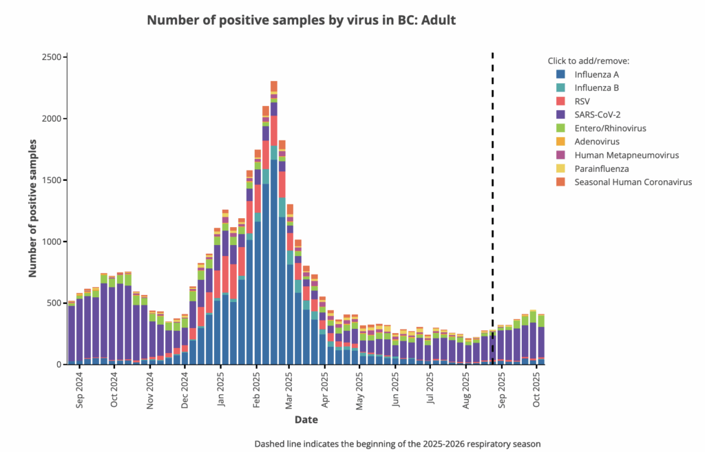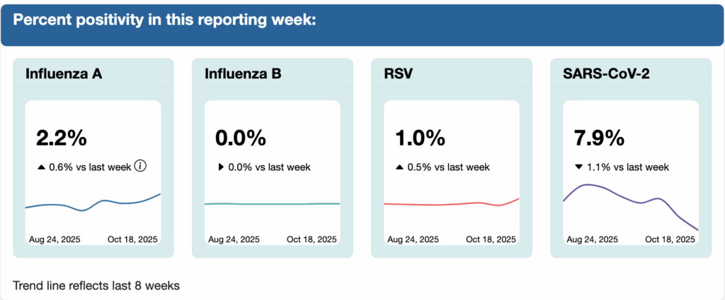 In the most recent data (ending 18 Oct) as reported on 23 Oct 2025, among influenza-like illness (i.e upper respiratory diseases) cases the province has test data for: