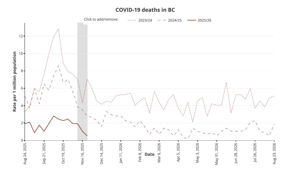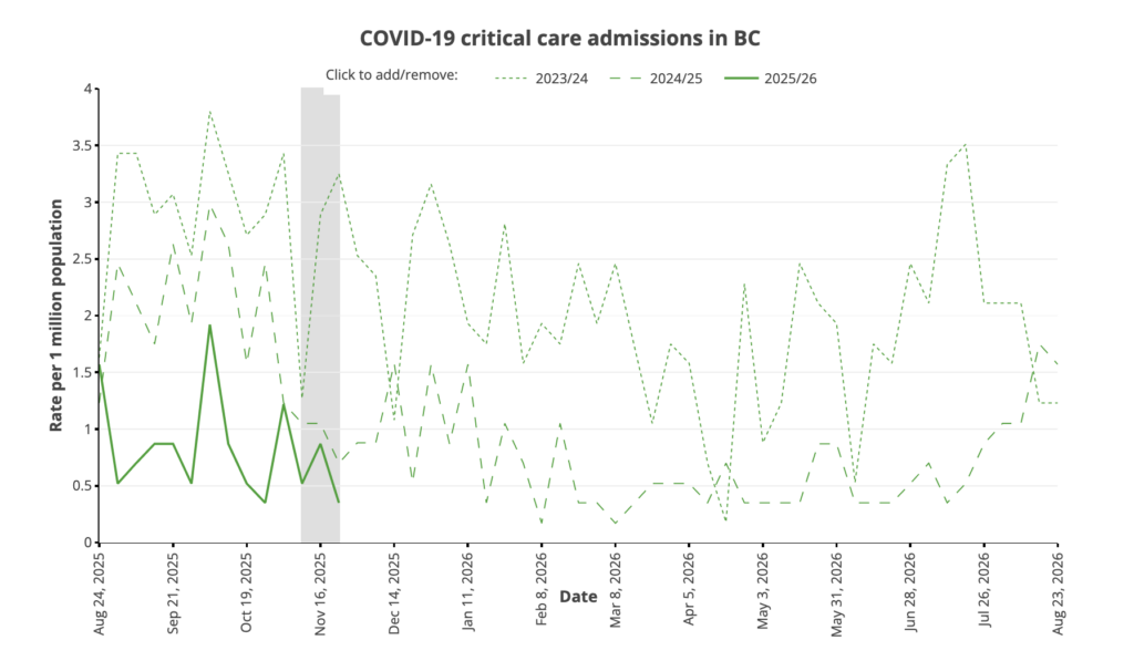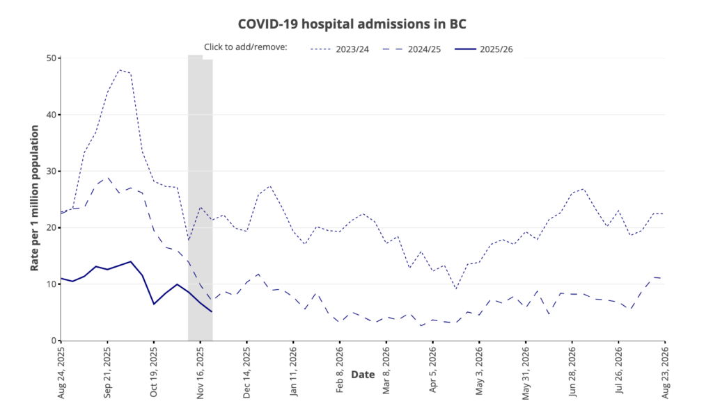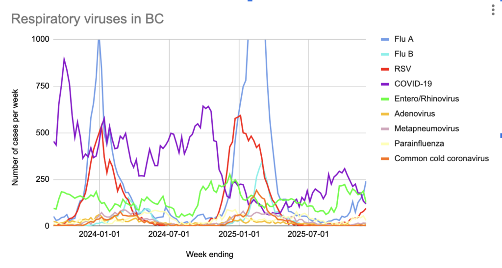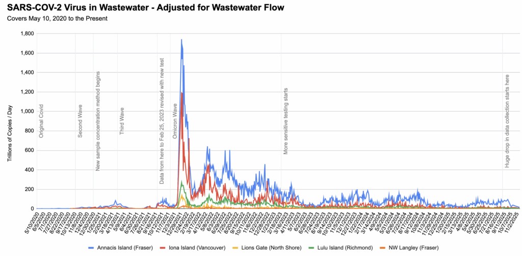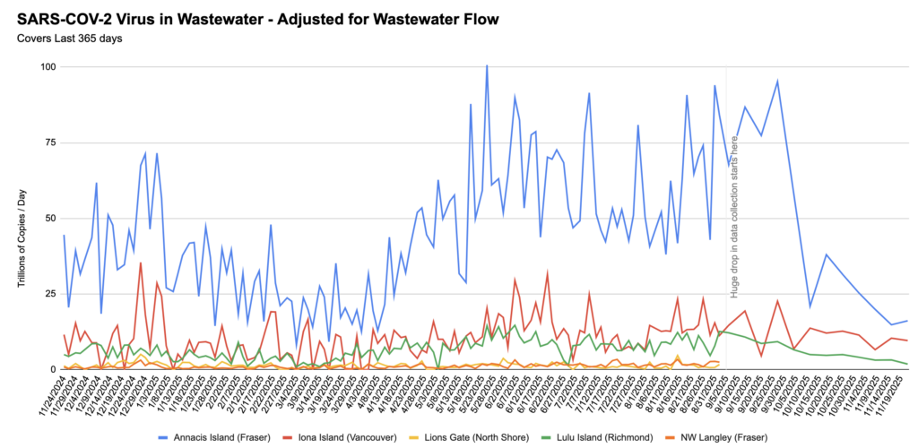 But 1) Fraser Health serves 44% more people than VCH and 2) the levels aren’t that different! From 2025-08-24 to 2025-09-21, Fraser Health had 553 cases while VCH had 360 cases. Just based on population alone, one would expect 518 Fraser cases for 360 VCH cases, so 553 Fraser Health cases is only about 6% higher in cases per capita. Meanwhile, Fraser Health wastewater levels were about 3 times higher.
