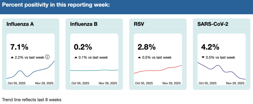 In the most recent data (ending 29 Nov) as reported on 4 Dec 2025, among influenza-like illness (i.e upper respiratory diseases) cases the province has test data for: